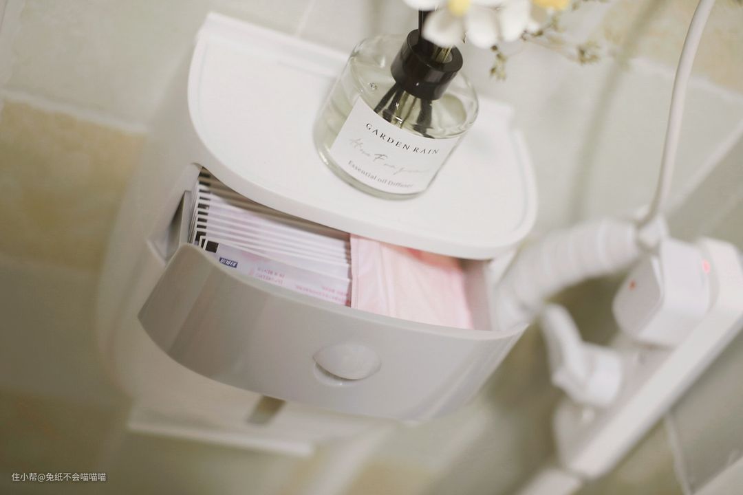 上层收纳女性用品,下层收纳纸巾,垃圾袋。顶部还可以放手机,我放了香薰。