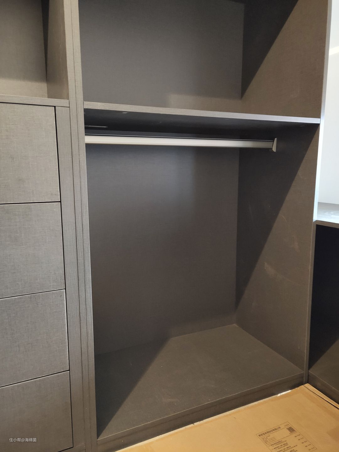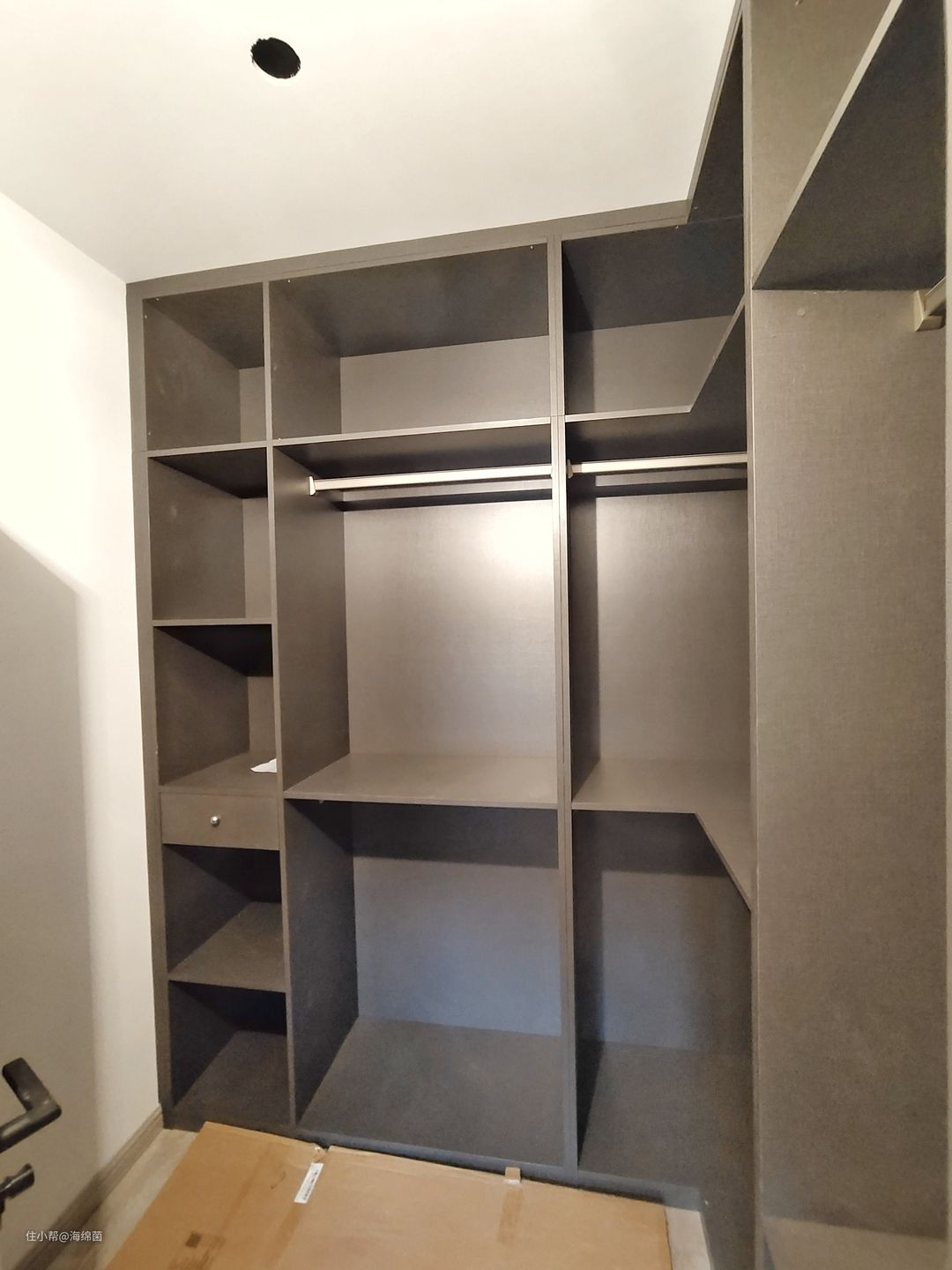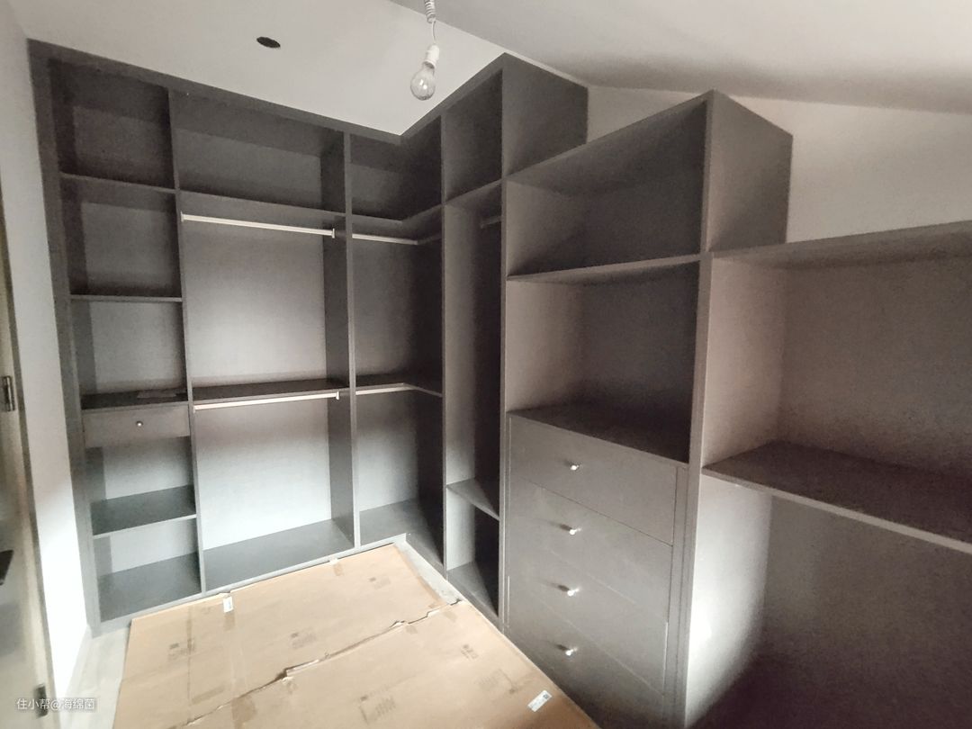 实物图的部分是下图这样的,用了手机广角拍摄,衣帽间刚做好,灯还没有装,地板上还铺着纸板保护,柜子上也能看到可见的灰尘,毕竟还咩有大保洁,大家看个大概就好。