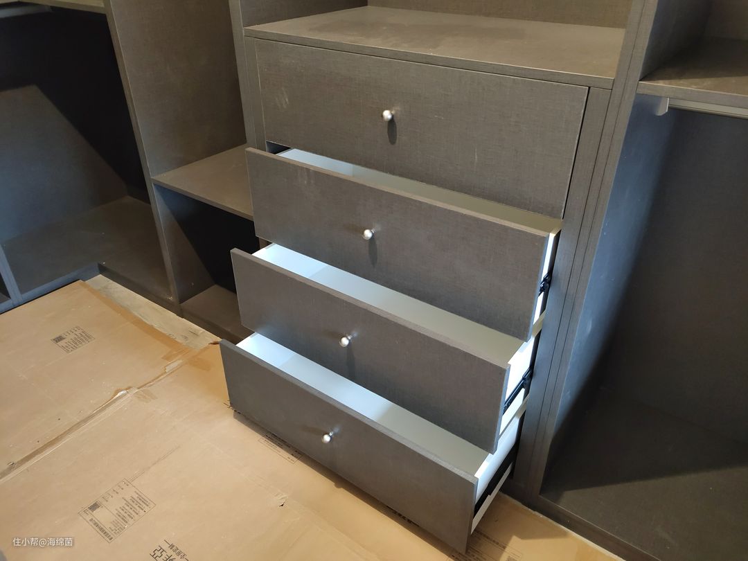 抽屉其实挺大的,差不多800mm款,如果比较考究的也可以做成有左右分割的双芯抽,我是决定之后用其他收纳盒来做内部分割的,也是出于成本上的考虑。