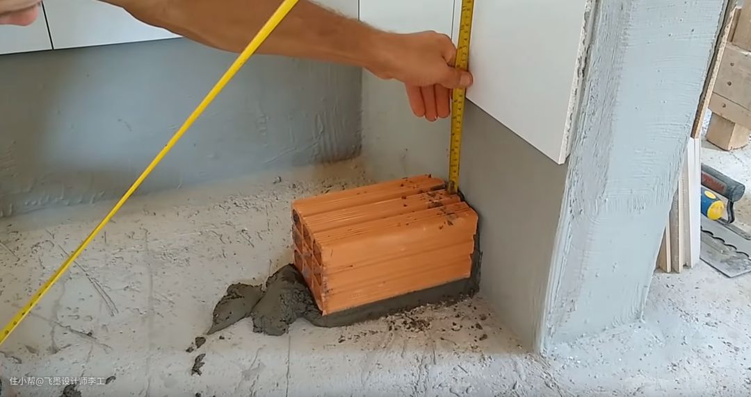 首先确定底座的高度和宽度。根据定制橱柜的高度和宽度,为了符合人体工学,确定砖砌底座的高度为15cm,而底座的宽度小于橱柜,确定为48cm。
