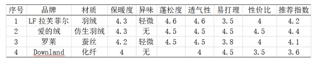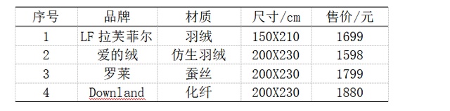 这张表格中,楼主列出了本文要对比的四款不同品牌不同材质的冬被 ▲