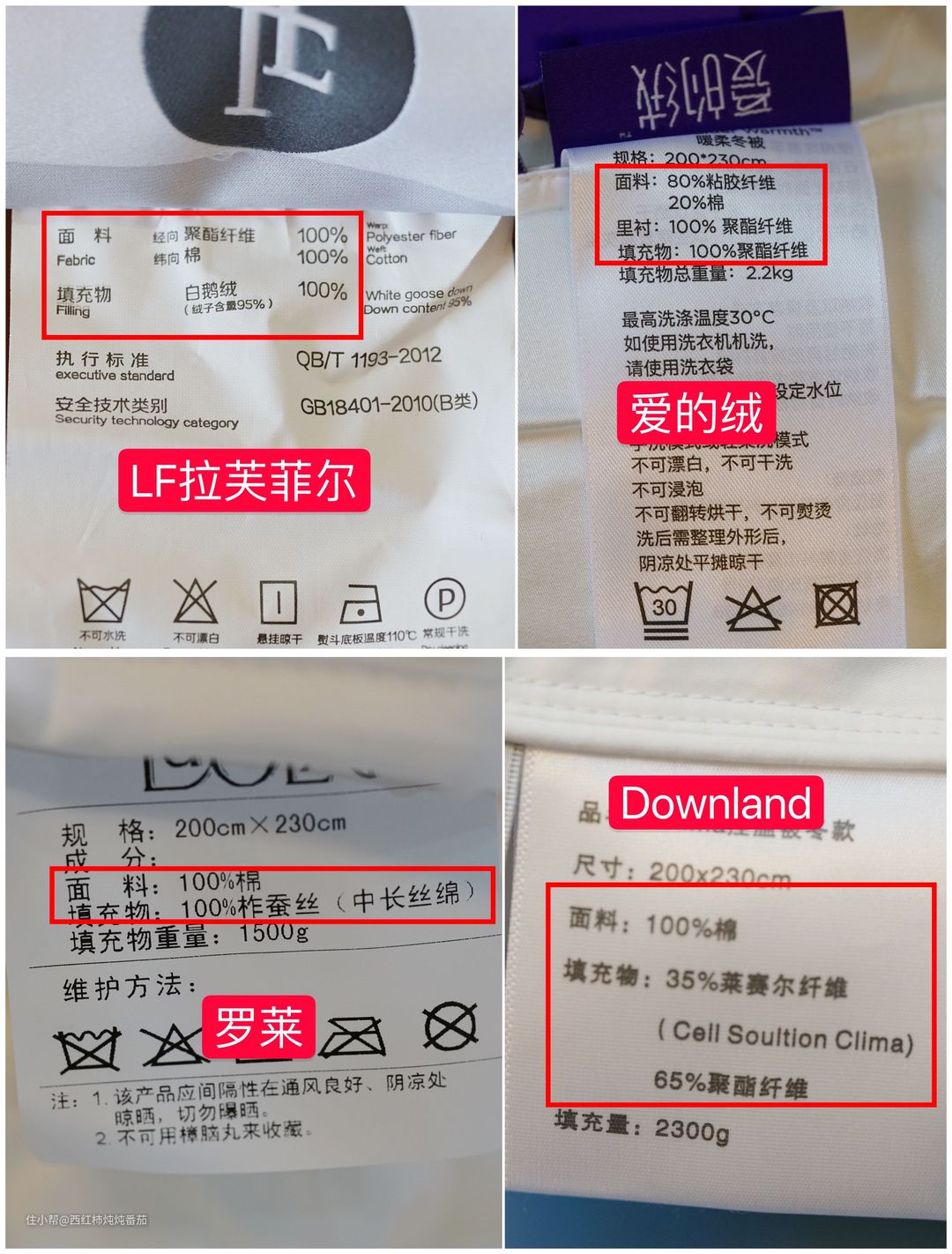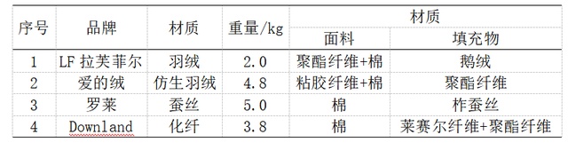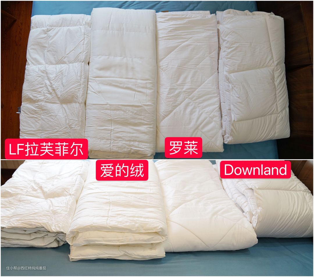 文章中涉及的四种不同材质的冬被品牌分别为:Downland-化纤;爱的绒-仿生羽绒(化纤);LF拉芙菲尔-羽绒以及罗莱-蚕丝 ▲