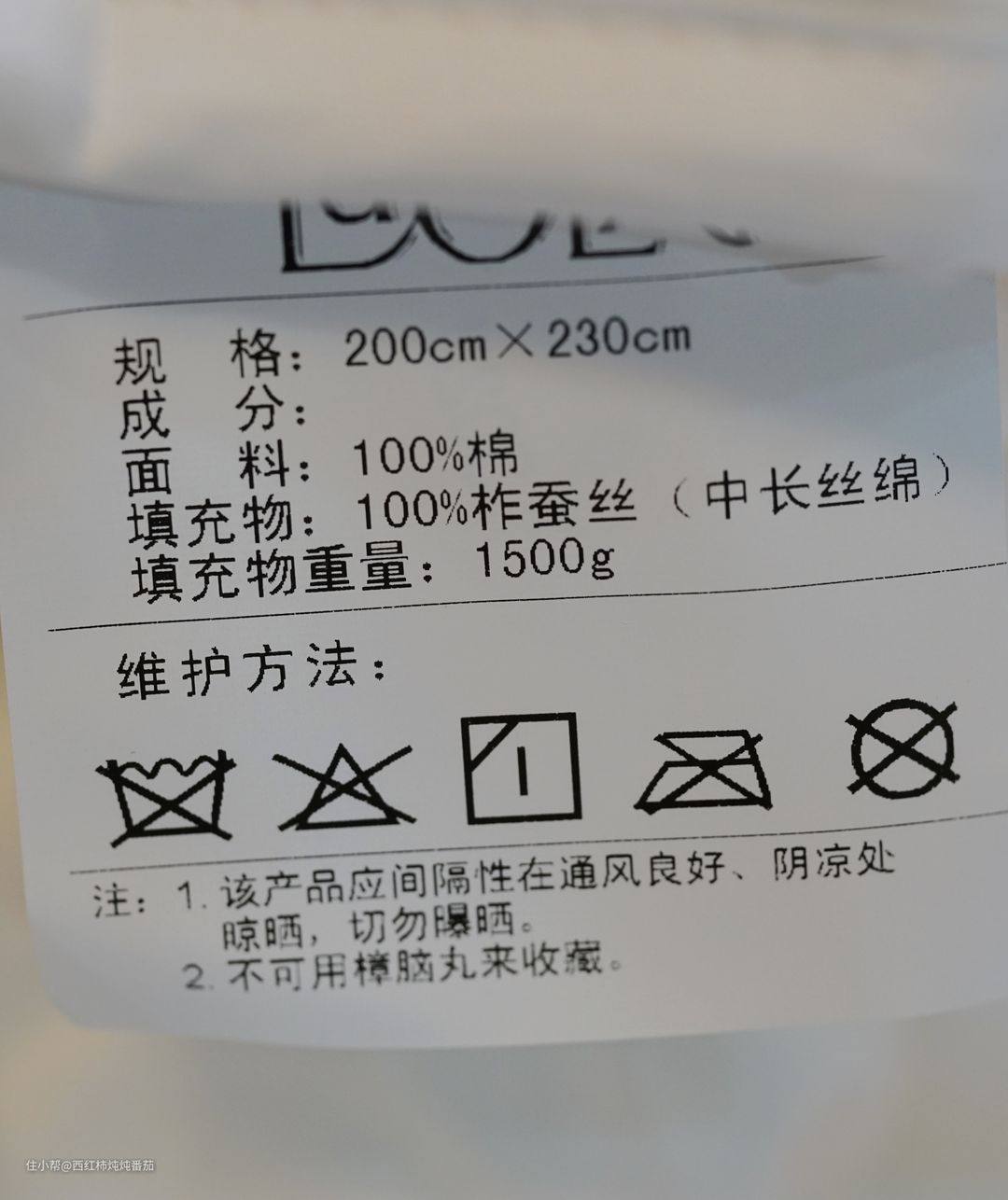 从标签下部的保养说明看,羽绒被不可水洗,不可漂白,只能晾干,不可高温熨烫。这也进一步证明了楼主上文提到的“保养难”的特点。