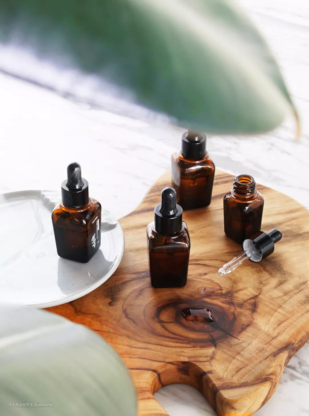 纯精油我们用了经典的碘酒瓶来装,液体香薰我们用了两款玻璃瓶,而最费心思的,则是蜡烛。