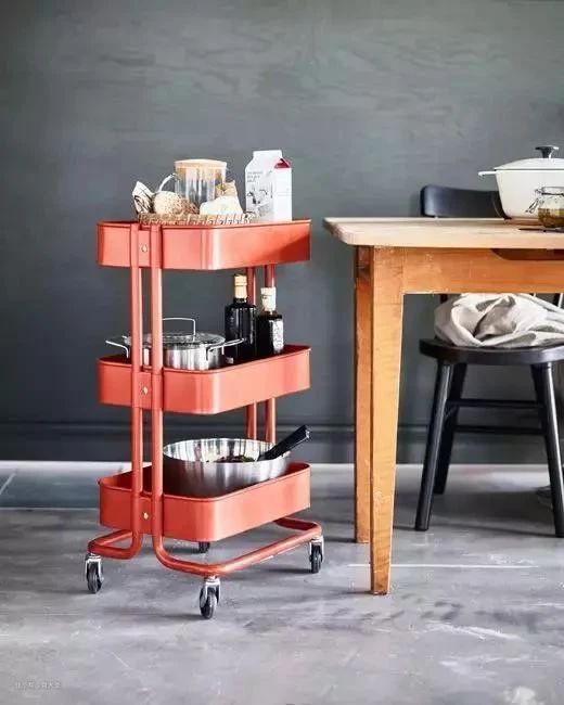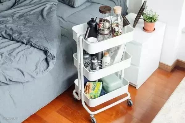 在沙发侧边和床头放置一个小推车,完全可以代替边柜和床头柜,而且更加灵活。
