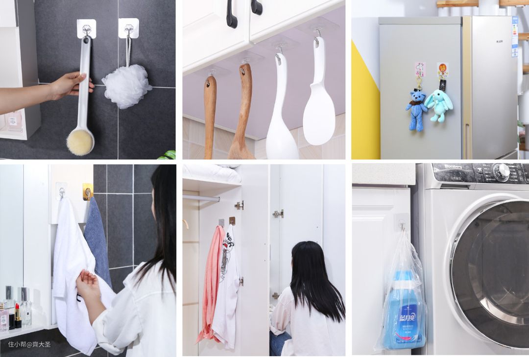 相当于3M胶粘款的升级版,一来不用打孔,二来撕下来的时候没有残胶,三来不贵,贴在墙上,挂点笤帚、浴巾、脸盆什么的方便的很,哪里需要贴哪里,上墙收纳法可以节省很多空间。