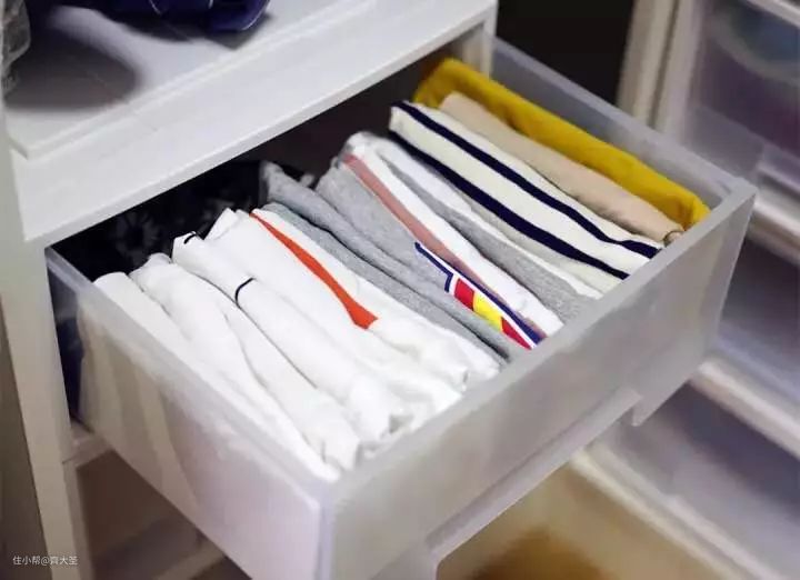 同这种抽屉,再搭配叠衣神技-让衣服站起来,找起衣服来一眼就能看到,不用一层一层往下翻,事半功倍。