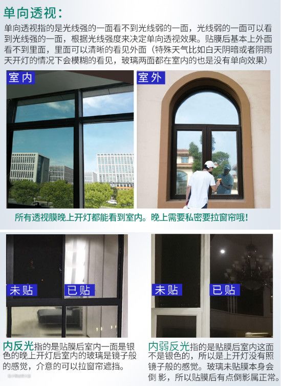 由于原理的关系,这种贴膜是光线强的一面看不到光线弱的一面,所以白天的时候使用没什么问题,阻挡紫外线的同时几乎对采光无影响(参照汽车贴膜),而且还能保证屋内的隐私。