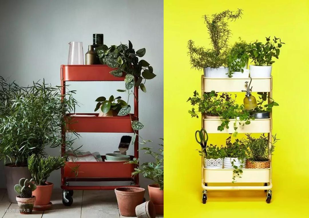 把各类植物放置在一起,灵活的移动性能保证植物全天的日照等自然条件,料理花草时候的工具也可以放置在小推车的侧面。