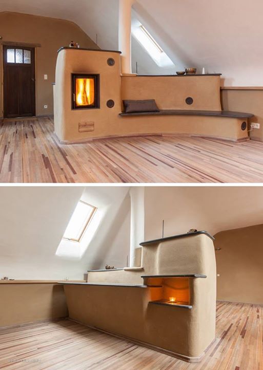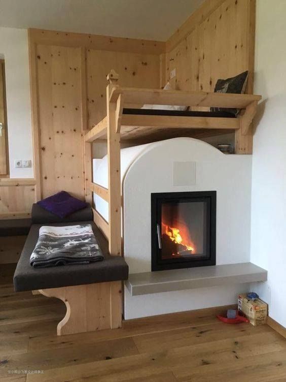 在国外除了将壁炉和卡座相结合的设计,也还有很多其他类似的设计,比如下面这种直接将床架在壁炉上的设计,下面下面在烧火,上面睡觉暖和和的都不用开空调了,它的加热原理就是和东北大炕很像,只是这个设计让人有点难以接受。