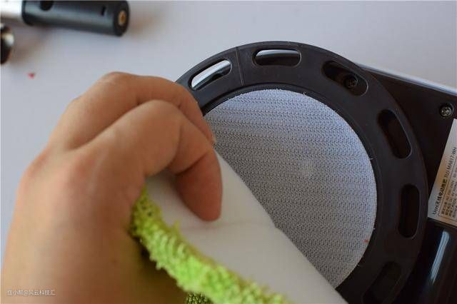 接着,我拿出绿色的这一组拖布开始安装,我打算干拖,所以并没有沾湿水,直接把拖布贴在主机机身的魔术贴上,吸附比较牢固,不用担心会在使用中途掉落。如果是湿拖则要先把拖布打湿水,再拧干多余的水份,然后再贴到魔术贴 上去。