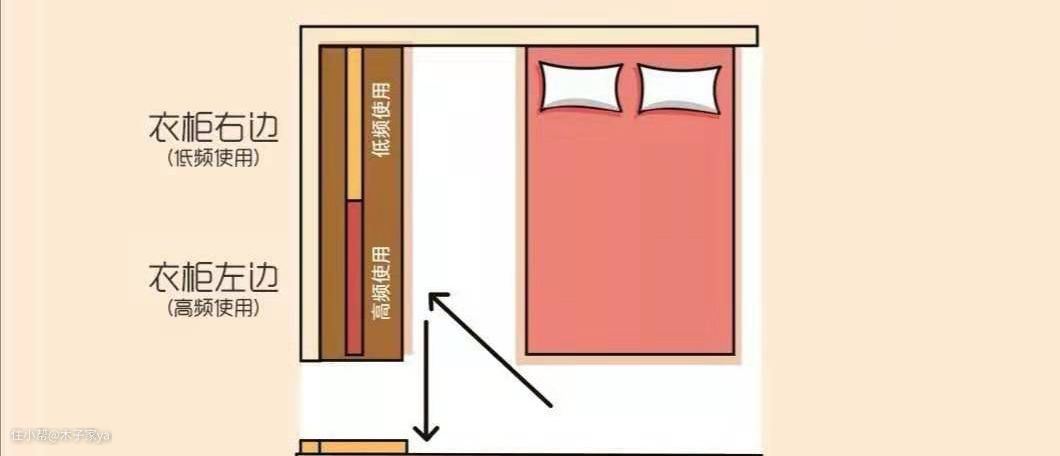 因为一些条件限制,我们的衣柜常常有些地方会常常使用,而有些靠近床头柜等地方不好开门的使用的少。在设计的时候,靠近开阔处容易拿取的地方,设计成放常用的衣物。而边角落位置则建议放一些不常用的衣物。
