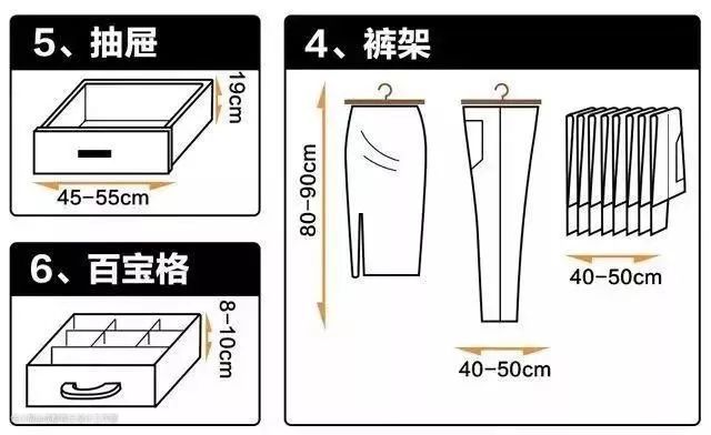 ②根据抽屉的高度,自而下依次摆放,高度最高的在最下面,首饰10cm/内裤袜子10cm>文胸18cm>t恤/衬衣20cm>毛衣/裤子28cm;
