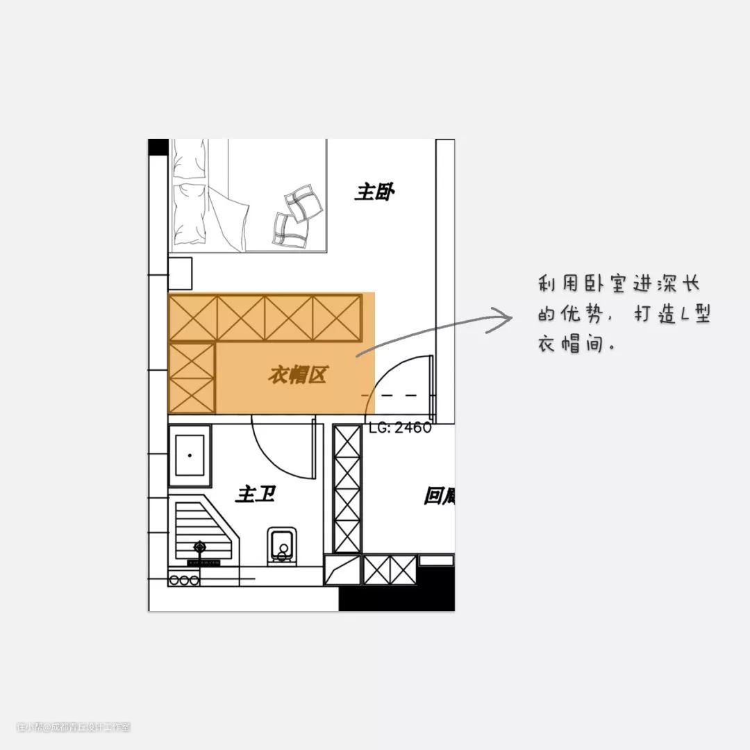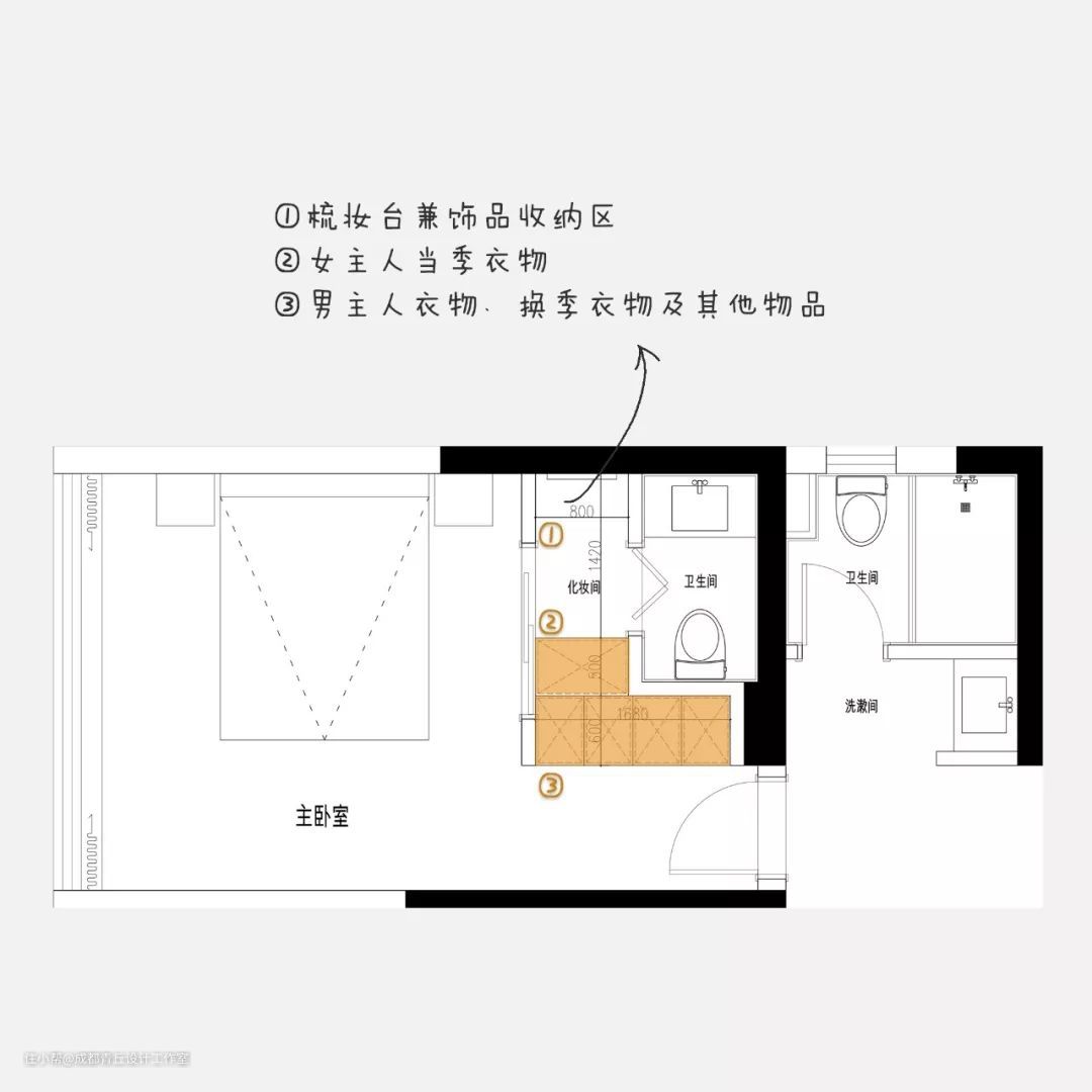 ②家里俩卫生间,功能重合了,根据自家生活习惯,看能不能撤掉主卫生间的“淋浴”功能,淋浴是相对马桶和洗漱较少的一个。这就取决于自家对衣帽间的需求程度有多大了!
