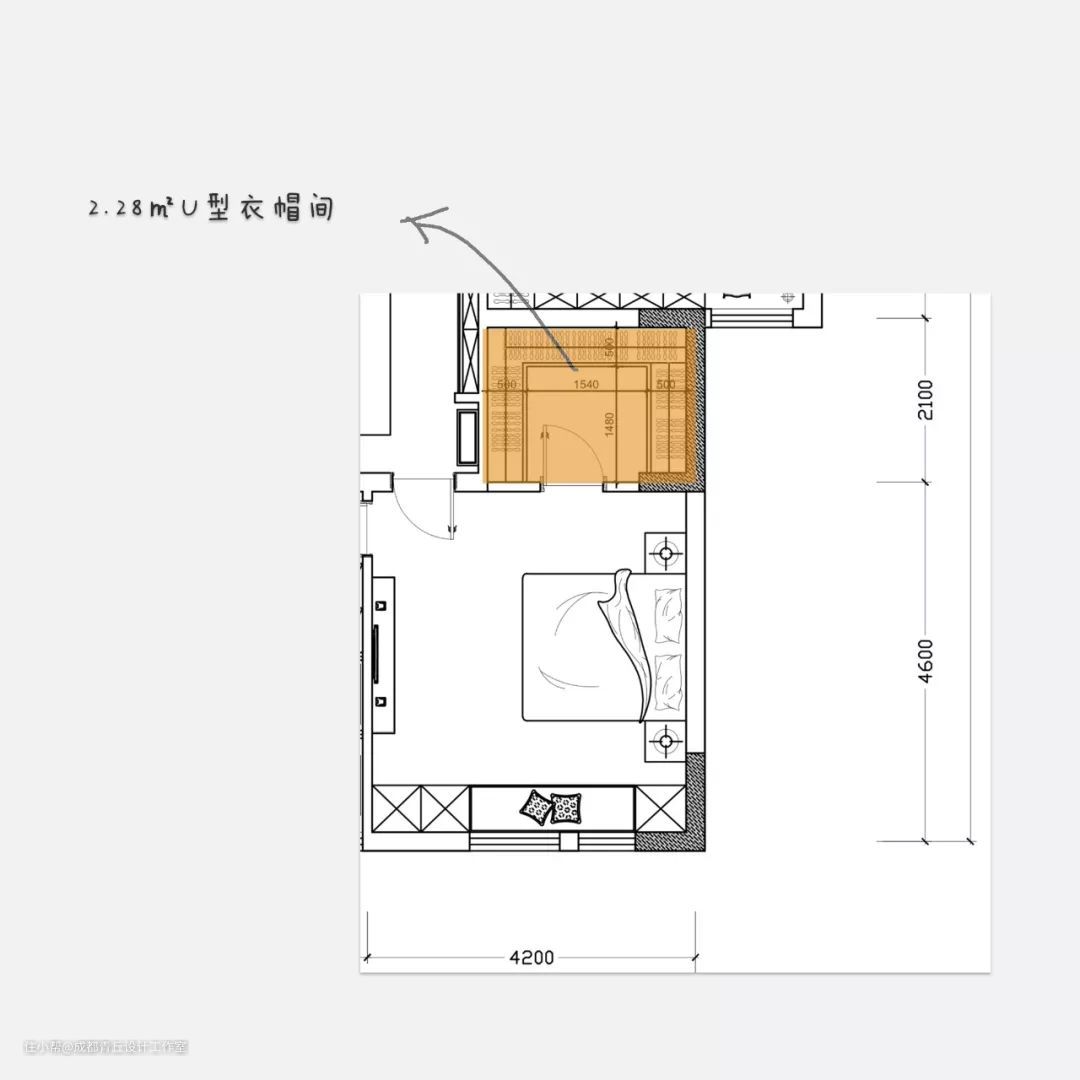 像下图▼所示,卧室开间长度在4.5m以上,总面积15㎡,衣帽间占2.85平,其中衣柜深度0.6m,长度约2m,过道预留的活动空间0.8m。而实际上,卧室面积只要在12㎡以上,一般情况下,都可以打造像这样约近3㎡的L型衣帽间。