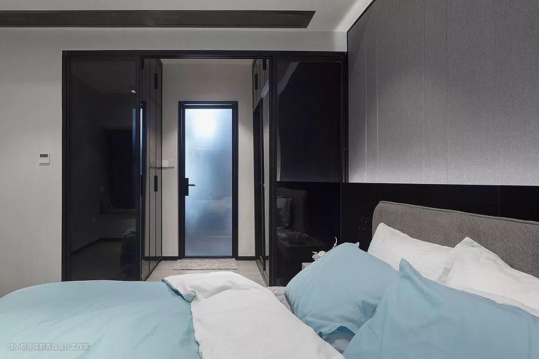 平行两边衣柜,外侧用玻璃推拉门封闭,保证隐私又不失整体性。操作上来说,难度是没难度的,只是符合这条件的卧室少,即便是某些稍大的户型,因空间被分割的太过细碎,卧室也很难达到这样操作的条件。所以整体上来说,需要有赢在起跑线上的运气,碰到合心意的户型,还是蛮不容易的。