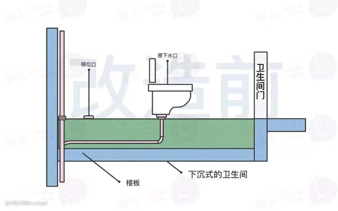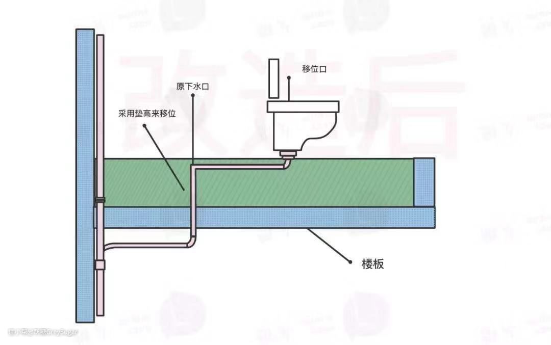 通过抬高地面的方式,隔层排水的马桶移位问题就类似于转化成了同层排水问题。只需要在抬高部分更改水管位置,就可以将马桶排污口移到想要的位置。