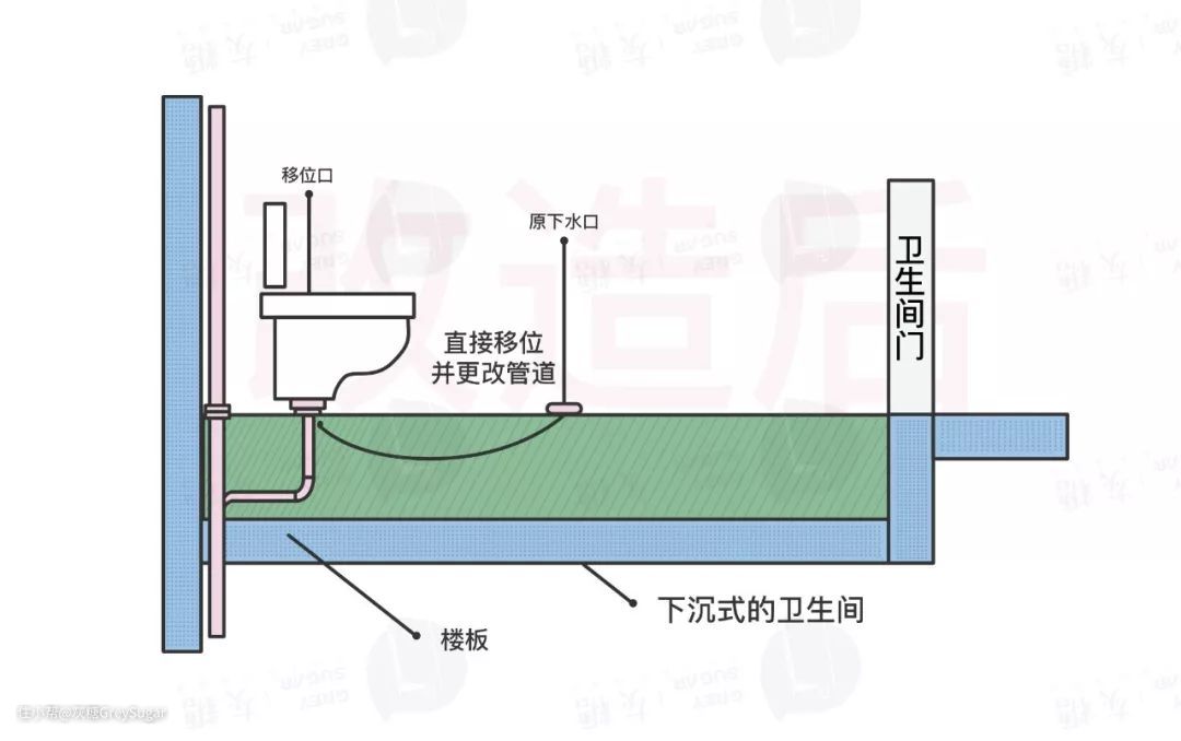 通过抬高地面的方式,隔层排水的马桶移位问题就类似于转化成了同层排水问题。只需要在抬高部分更改水管位置,就可以将马桶排污口移到想要的位置。