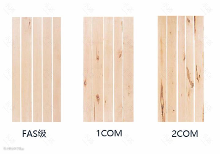 在美国,木材品质分为FAS、1COM、2COM这样的级别,FAS级最优,每高一个级别,单位体积木材价格高30%~45%。厚度常见规格有4/4、5/4、6/4、8/4这四种,厚度增加一倍,单位体积木材价格提高约30%。