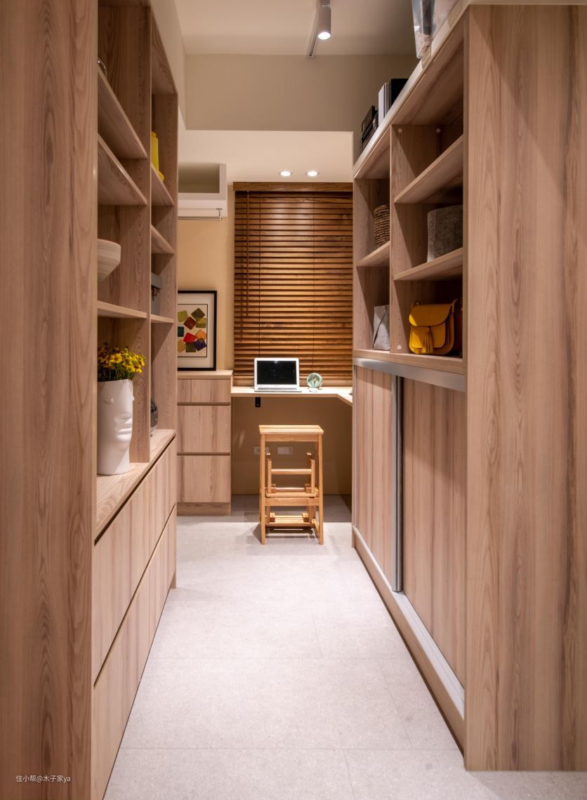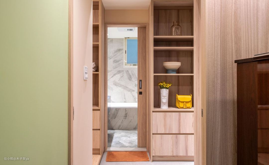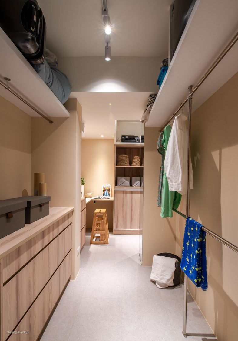 主卧还带有一个衣帽间,并且采用开放式收纳。在这里形成一个小型家务区,放置了干衣机和洗衣机,干好的衣服可以快速放在更衣室里。