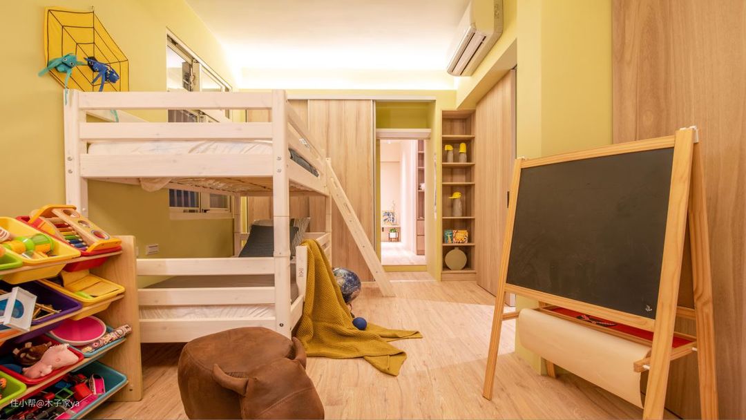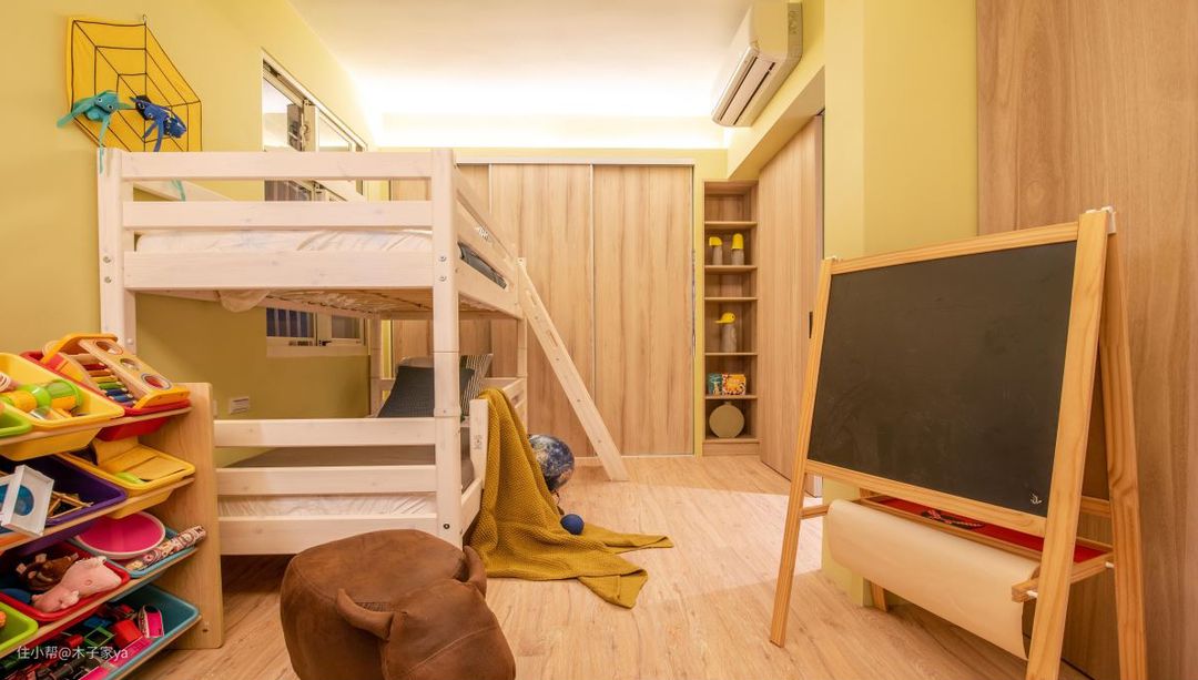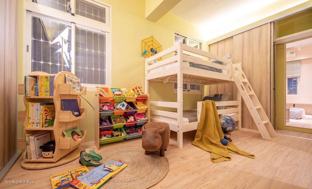 之前两个小孩房分隔开,每个房间都很小,把两个小孩房打通,合并一间。让他们拥有足够玩耍空间,等长大后又可以隔开成为两个独立空间。