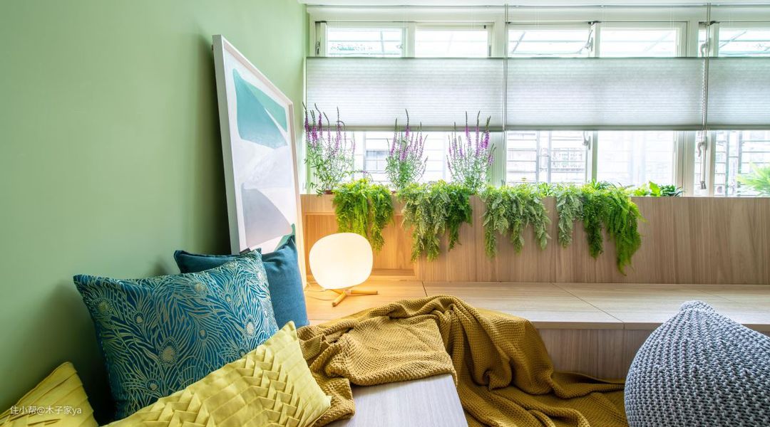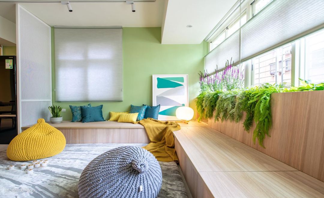 客厅没有采用传统的沙发+茶几+电视柜的做法,而是采用通铺。一进门看到整个空间刷了绿色墙漆,充满绿意,做了L型榻榻米,不但可坐、可卧、可躺,还有惊人收纳。