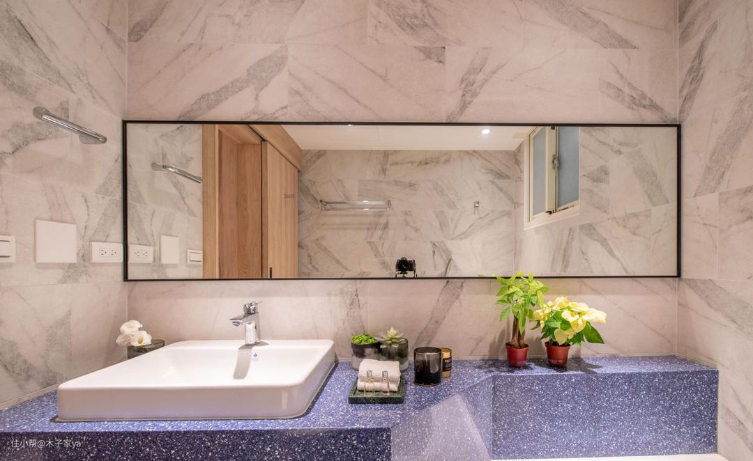 浴室柜采用长镜设计,有放大空间效果,并且采用很特别的蓝色水磨石,充满不同的设计风采。