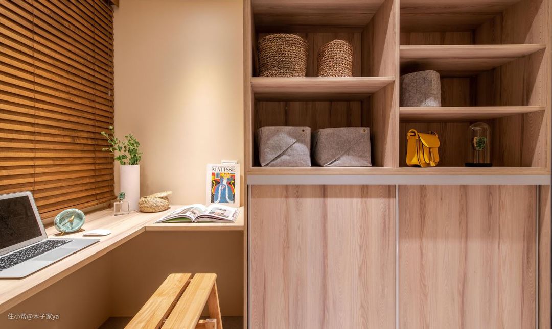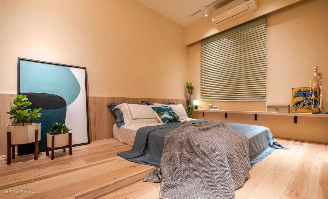 主卧的色调偏向温馨调,没有床,直接是床垫,可以随时打地铺。并且在窗边设计了长排桌子,既可以梳妆台又可以书桌来使用。