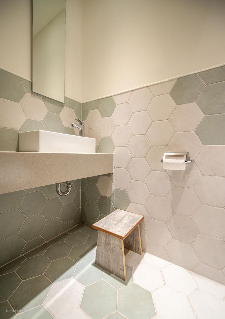 客厅卫生间很小,设计得很小清新,地面铺六角砖,并且半墙砖,上面刷漆。整个空间显得很清新舒服。