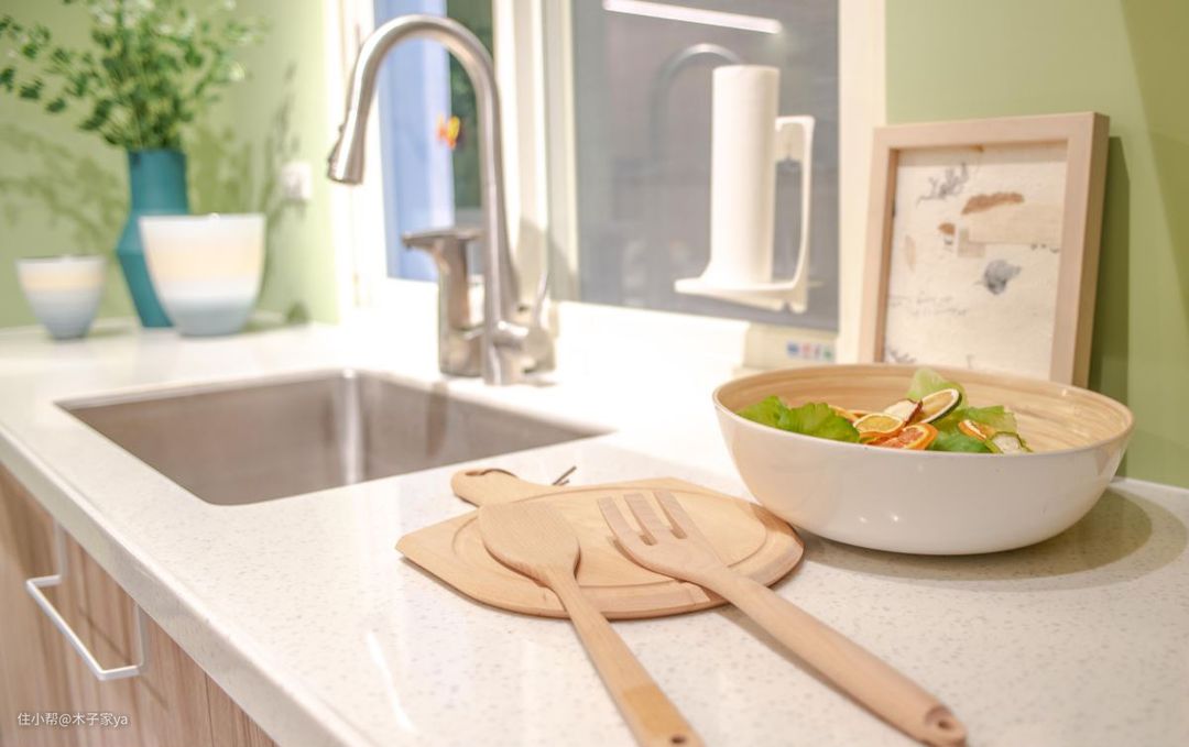 餐厨空间采用开放式,是全家重心所在,长形餐桌搭配人造石中岛,类似于日本寿司料理台。
