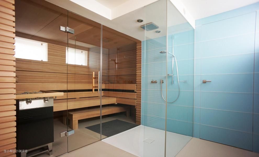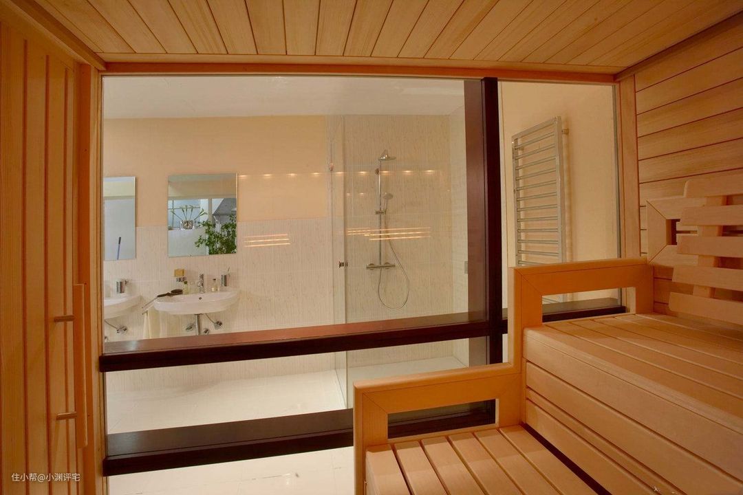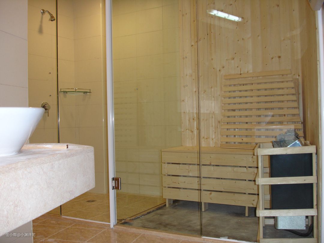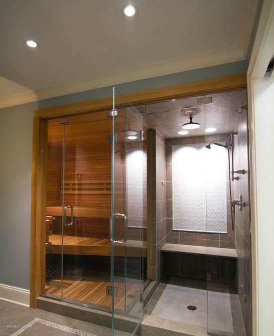 汗蒸房和淋浴区之间的那道隔断需要格外注意——可以用钢化玻璃做隔断,就像普通的淋浴房那样。如果用玻璃做隔断,需要让玻璃“顶天立地”,不留缝隙(普通淋浴房的玻璃隔断,需要在顶部预留20cm通风)。