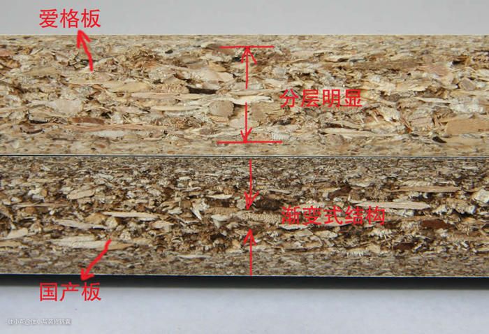 其制作过程与密度板差不多,也是把材料加胶再热压。两边两层是细刨花,中间夹着质地粗一些的刨花。