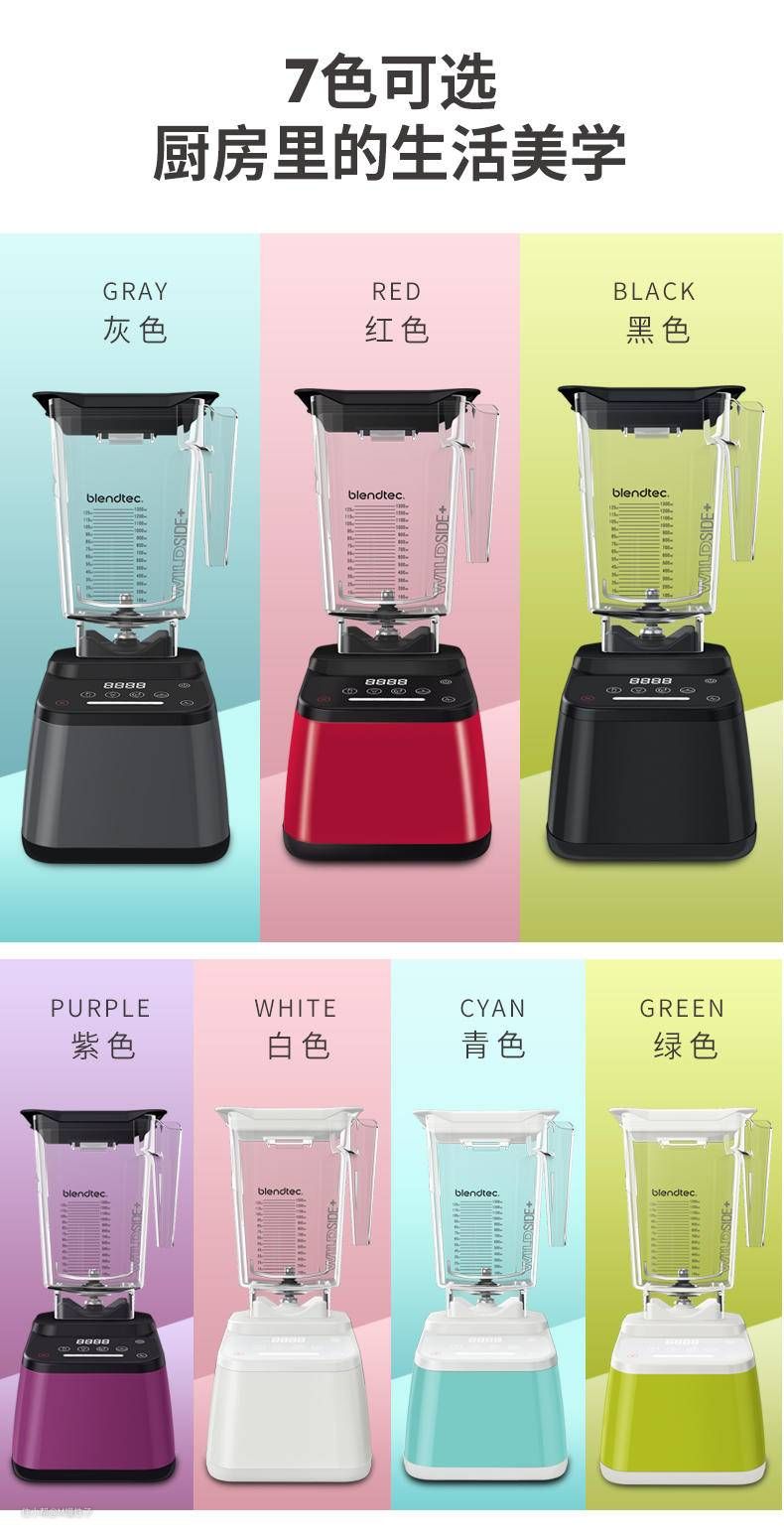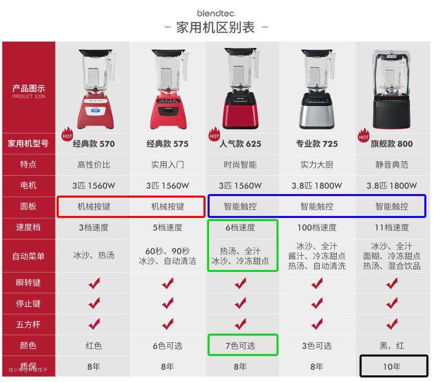 ▼一张图看懂blendtec国行在售型号,一共有5、6、7、8四个系列。入门的5系也采用了3匹大扭力电机,除了入门型的5系采用机械按键,其他系列均采用触控按键,同时从6系开始自动程序都比较齐全。7系开始电机功率增大到了3.8匹马力 1800w,8系为旗舰系列在7系基础上增加了独有的隔音罩以及10年质保,800也是行业旗舰机型。