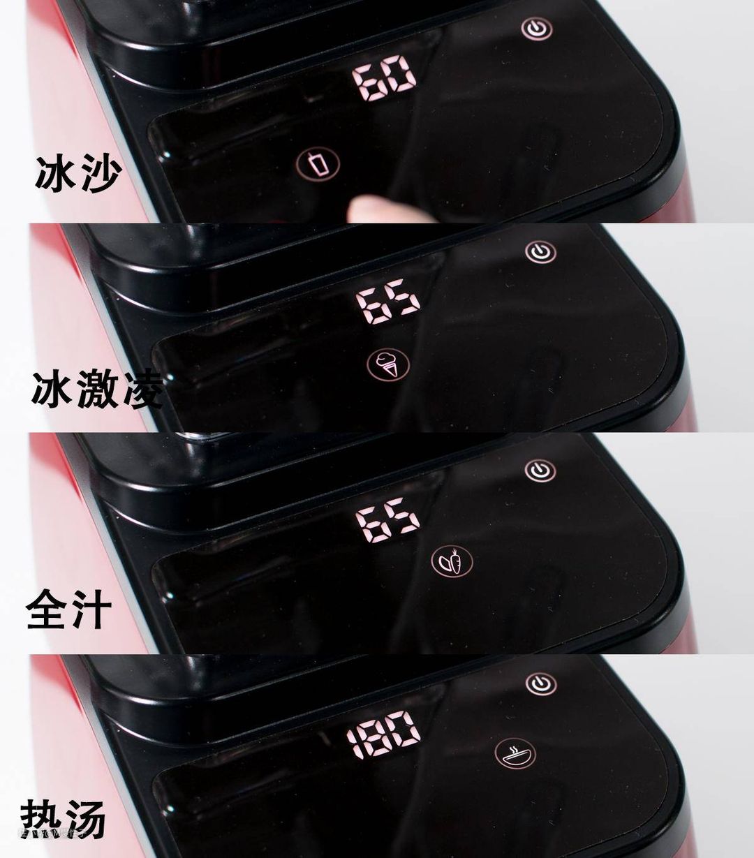 ▼一共四挡自动菜单,包括冰沙60s,冰激凌65s,全汁65s,以及热汤180s,当然这不是简单的时间概念,有不同是扭力档位在其中,比如都是65s,实际的档位是不同的。并且程序有个有个由慢到快再到慢的过程。