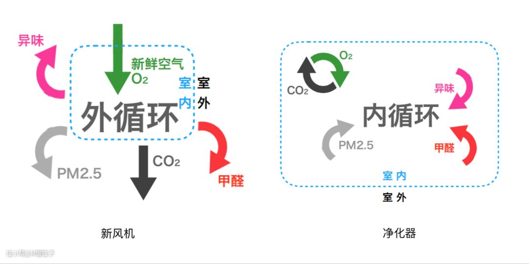 新风机可以理解为外循环,新鲜空气经过新风机hepa滤网过滤掉灰尘以后进入室内,含有甲醛、二氧化碳的废气经过微正压或者负压排出到室外,形成外循环。