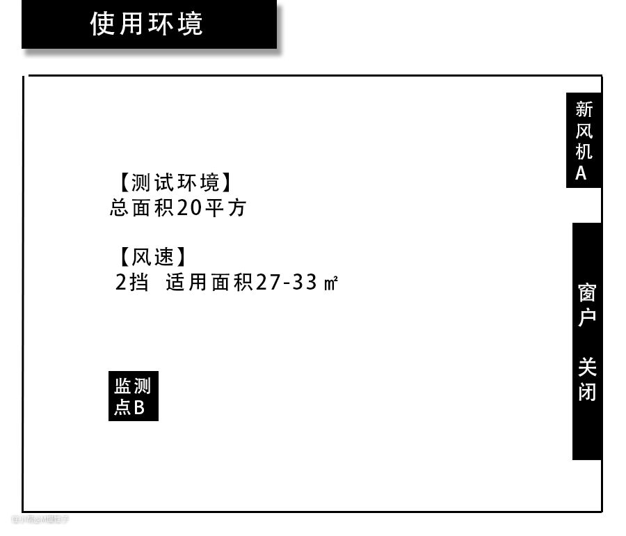 ▼新风机装在20平米的客厅内,测试时使用手动2挡风量,关闭窗户,两个检测点位,一个是新风机自带的A点,另一个使用自有检测仪的B点,B点在远离新风机的对角,更利于反应整个房间的效果。