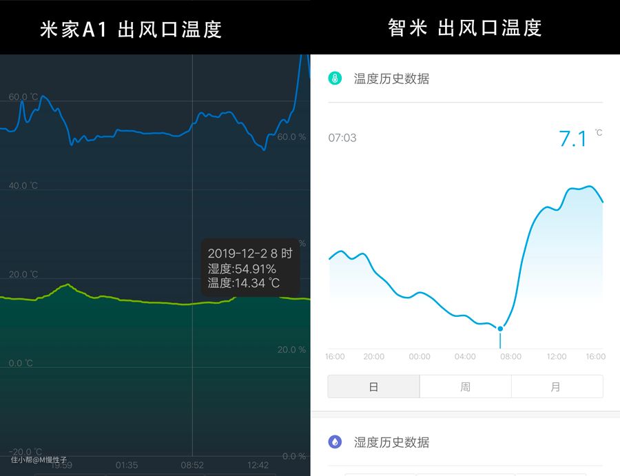 ▼今日寒流来袭,夜间的最低温度只有4℃左右,看看有辅热的米家A1,和无辅热的智米的出风口温度实测。长期监测数据对比,智米由于没有电辅热长期都在10℃以下,最低到7℃,使用中能感到一阵阵的凉风。而米家的A1则最低也在15℃以上,出风不会有凉意。电辅热在冬天确实必须了。
