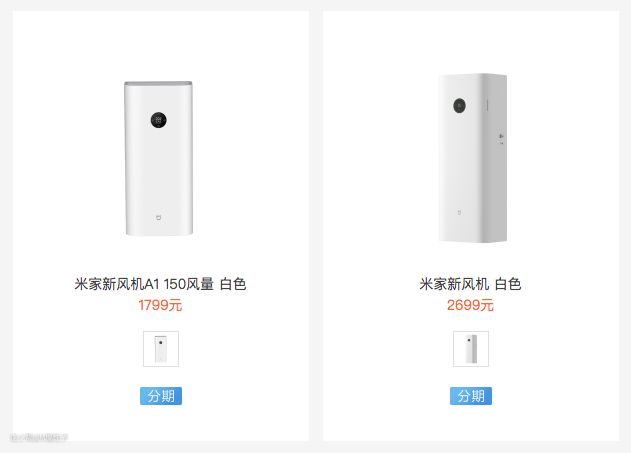 米家新风机A1 150风量零售价 1799元包含安装。智米新风 零售价 1499元 安装299元,共1798元,可以说两产品就是同价位