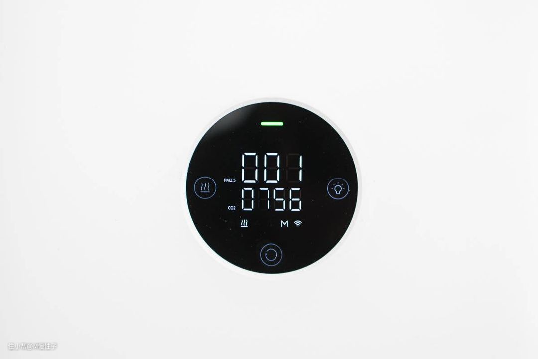中间是pm2.5以及二氧化碳的数值显示,底部是三个状态显示,分别是辅热、风量模式、以及wifi状态。侧面的三个圆环,分别是辅热开光、灯光开光、以及底部的风量模式切换开光。