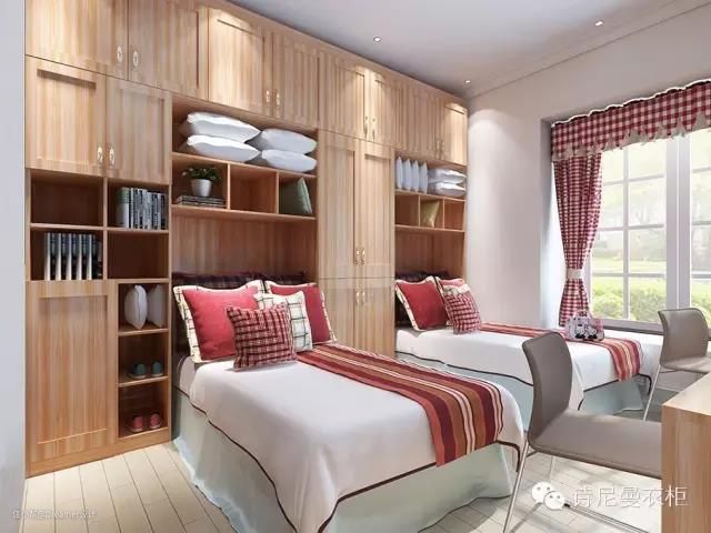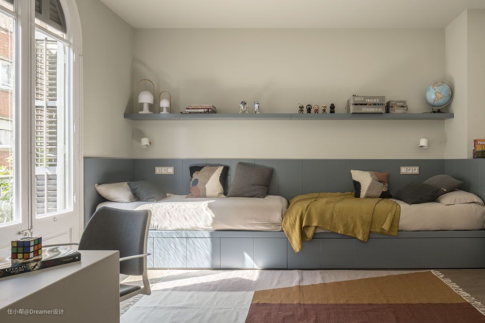 如果空间足够大,两张儿童床还可以并列摆放,床头背景墙设计成壁柜,增加房间的储物空间。床尾靠墙设计成双人书桌,两人都有自己的学习与休息空间。