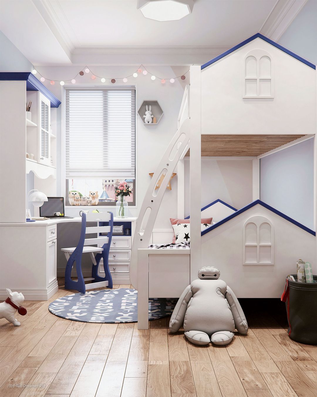 双人儿童房,最常见的布置方式就是在房间放置儿童双层床,可以节省一部分空间,相互交流也很方便。角落可以再放置儿童书桌。