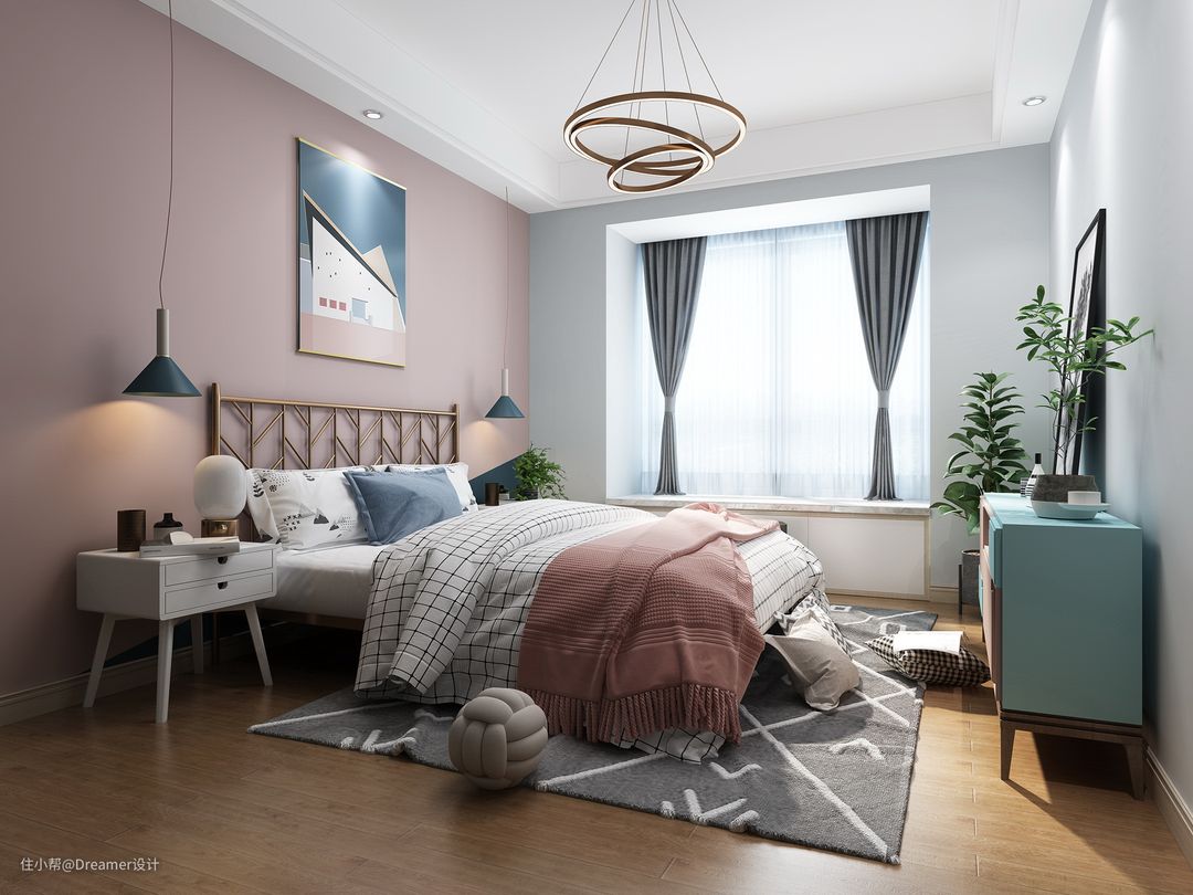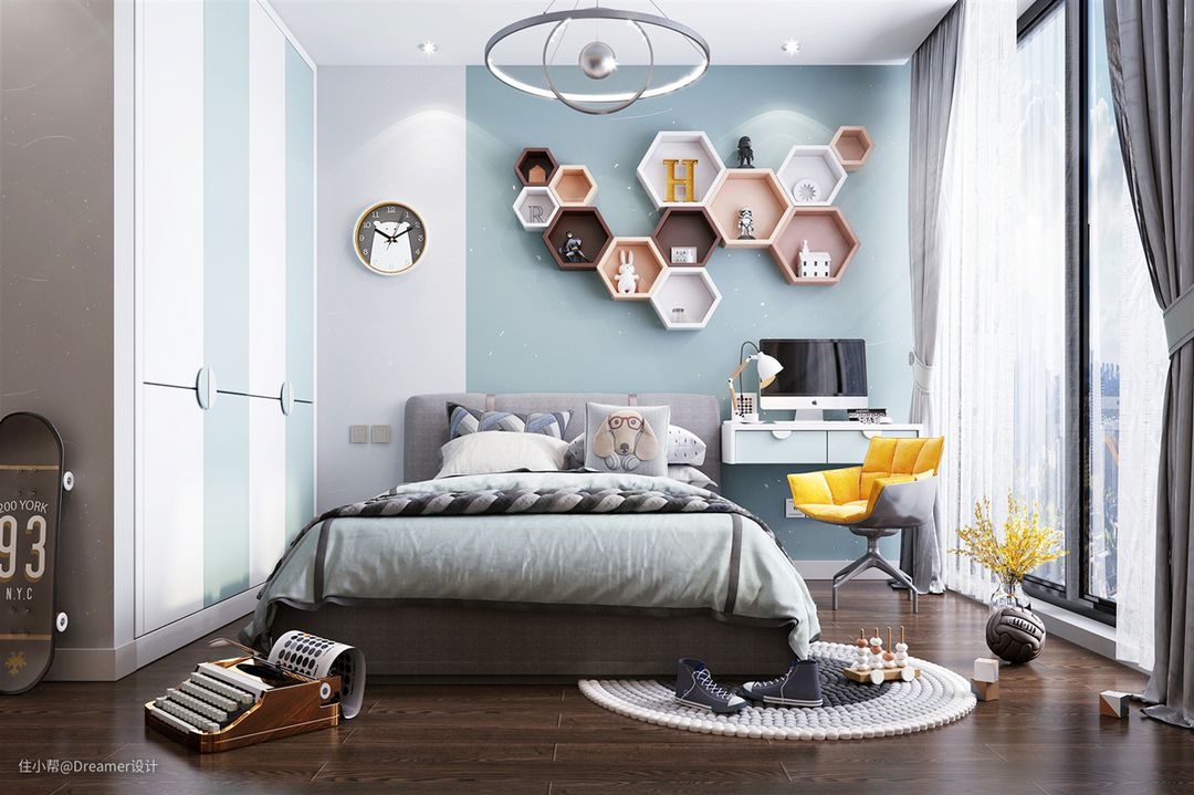 作为儿童房,也可以参考主卧的常见布置方式:床+床头柜+衣柜。床头柜也可以换成儿童学习最需要的书桌。