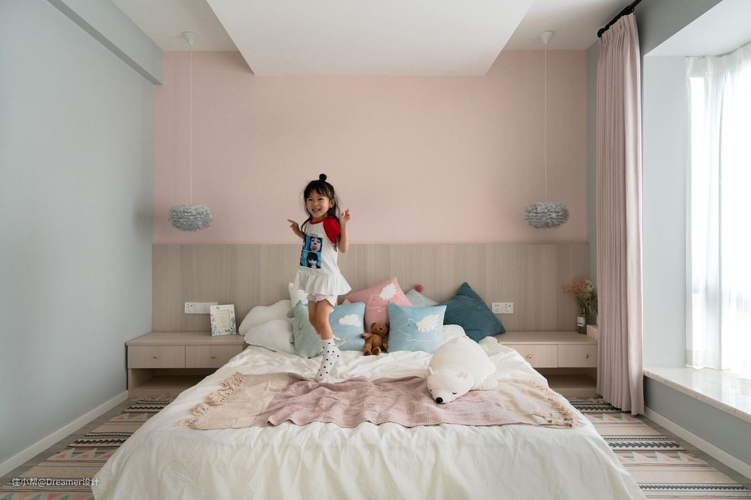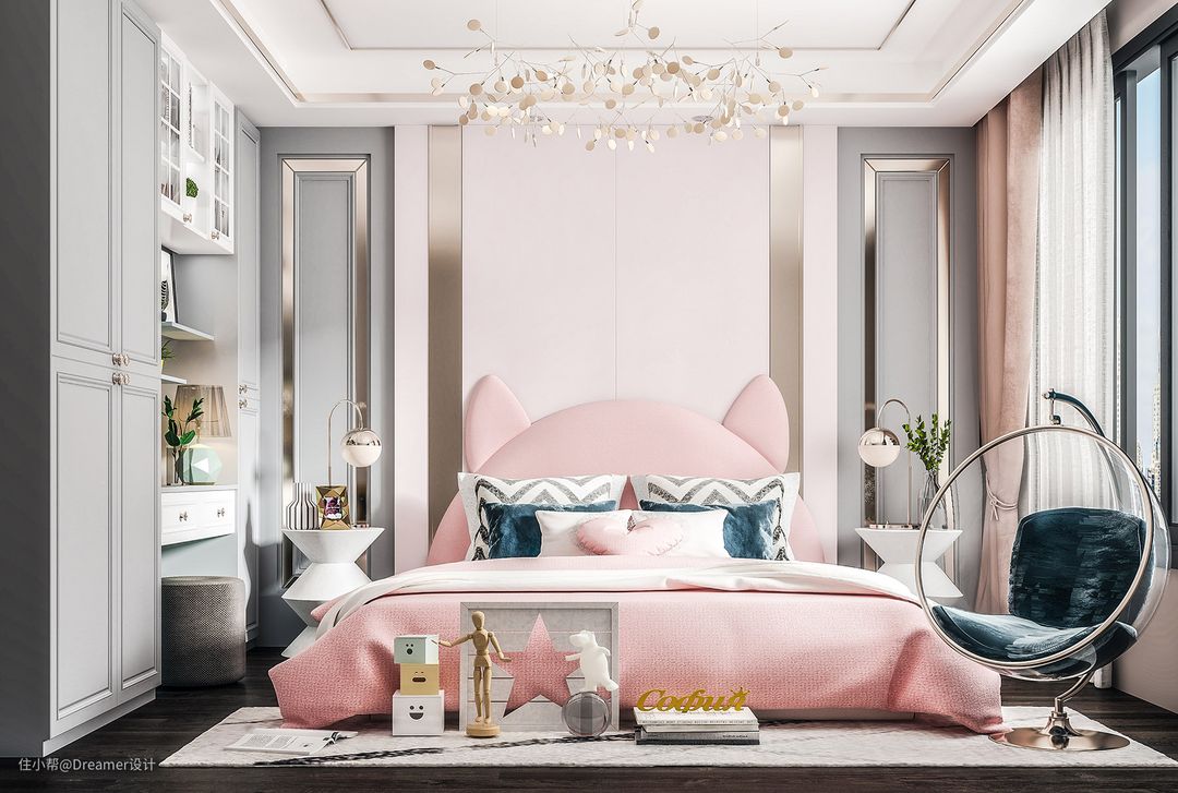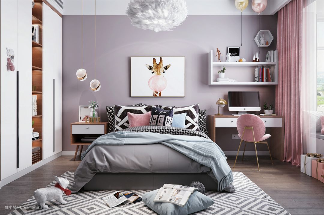 虽然布置方式和家具相同,但是儿童房多选用活泼鲜艳的色彩、卡通图案进行装饰,如粉色系(女孩房)、蓝色系(男孩房)的墙面,各种动物形象的挂画、抱枕,布偶……一眼就让人看出这是儿童房了。