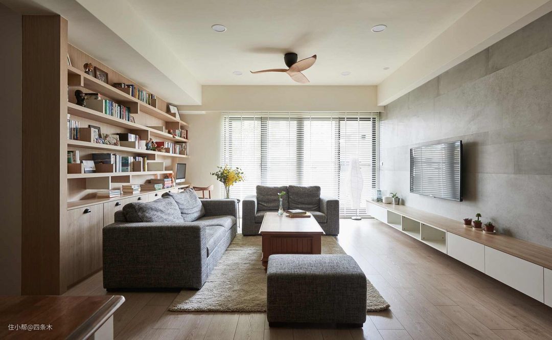 如果你家客厅没有足够的空间设计个开放式书房的话,也可以直接定制一个书柜,这样也可以满足在客厅阅读的需求。