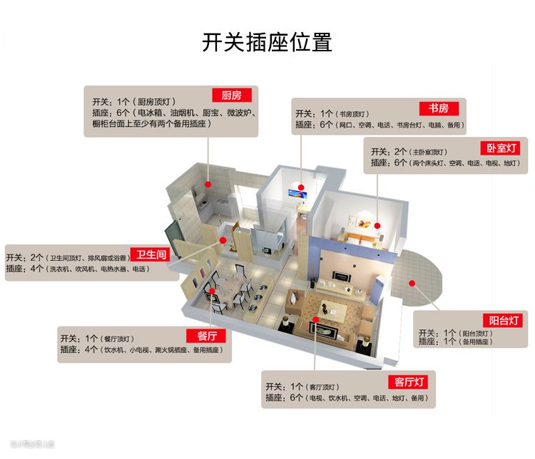 2 厨房台面、餐边柜、书房:小功率电器多的地方用三联排3 电视柜:有电视有路由器还有小功率电器的用五联排