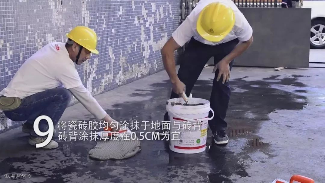 在地面均匀铺上一层瓷砖胶,形成半干的一层,再次用瓷砖胶填平表面凹凸处,厚度为0.5CM左右;适当条件下,可同时将瓷砖胶均匀地抹在瓷砖背面,要求瓷砖胶涂抹饱满。