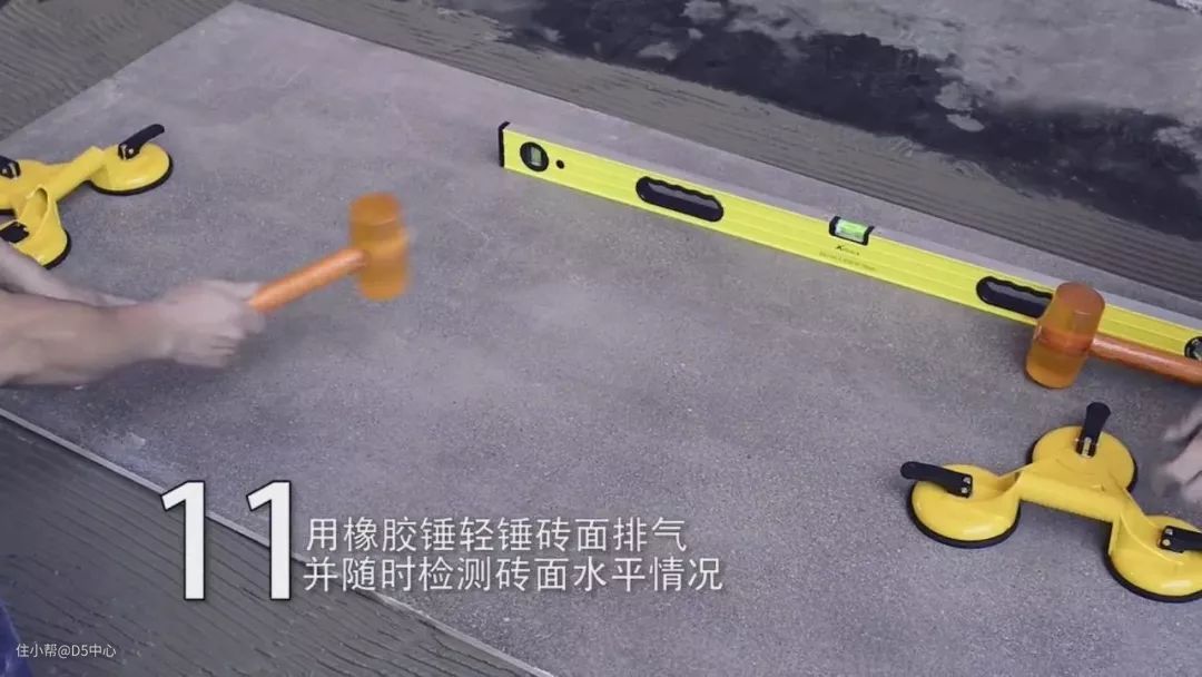 将瓷砖平整地铺贴在基层上,使用橡胶锤将瓷砖拍实铺平,便于排出气泡,轻敲砖面,让砖底能全面吃浆,以免产生空鼓现象。用木锤把砖面敲平整的同时,以靠尺测量,确保瓷砖铺贴水平。