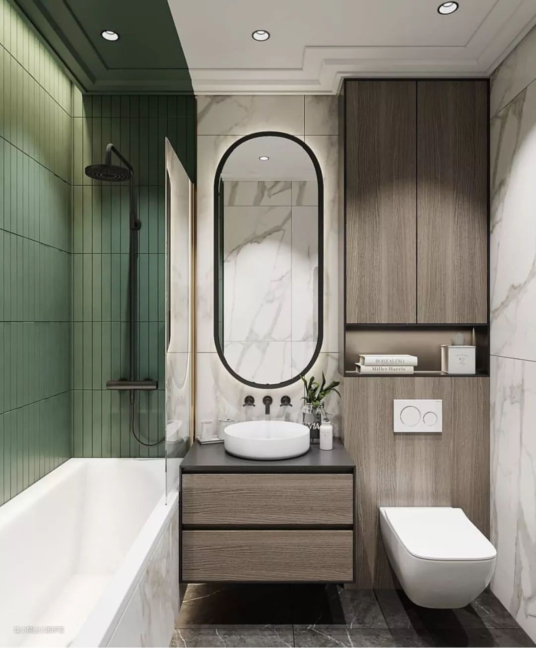上图中这样的设计,就是在心里依然保持了对淋浴的敬畏。但事实是,淋浴的用法最随意,随便找个角落就能冲。比如淋浴、浴缸一体设计,站在浴缸里冲淋浴,先冲后泡多舒服▼