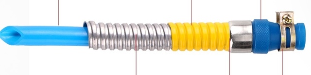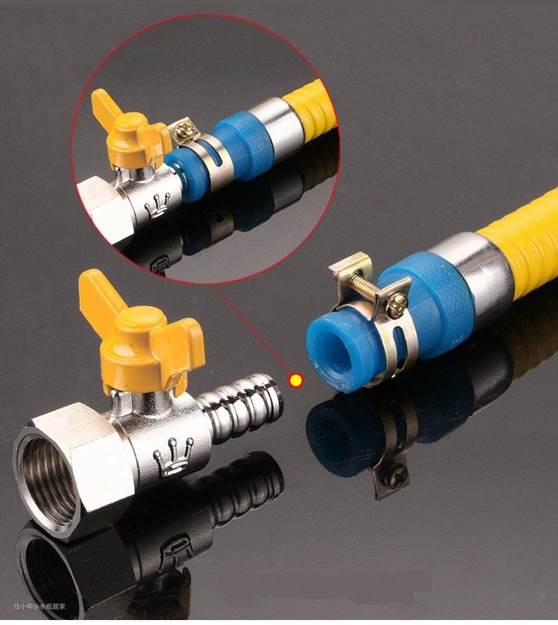- 铠装金属软管,为规避橡胶类软管的弊端,在胶管外侧封装了金属编织层从而形成了铠装金属软管,该种软管柔韧性和橡胶软管类似,但弯曲时不会折瘪、塌陷、堵气,由于其金属层,可以防止鼠咬,设计使用寿命也较长一般和灶具同寿命,为8年左右。然而其接口依然是软塑料或者橡胶材质,不免有老化和密封性问题。