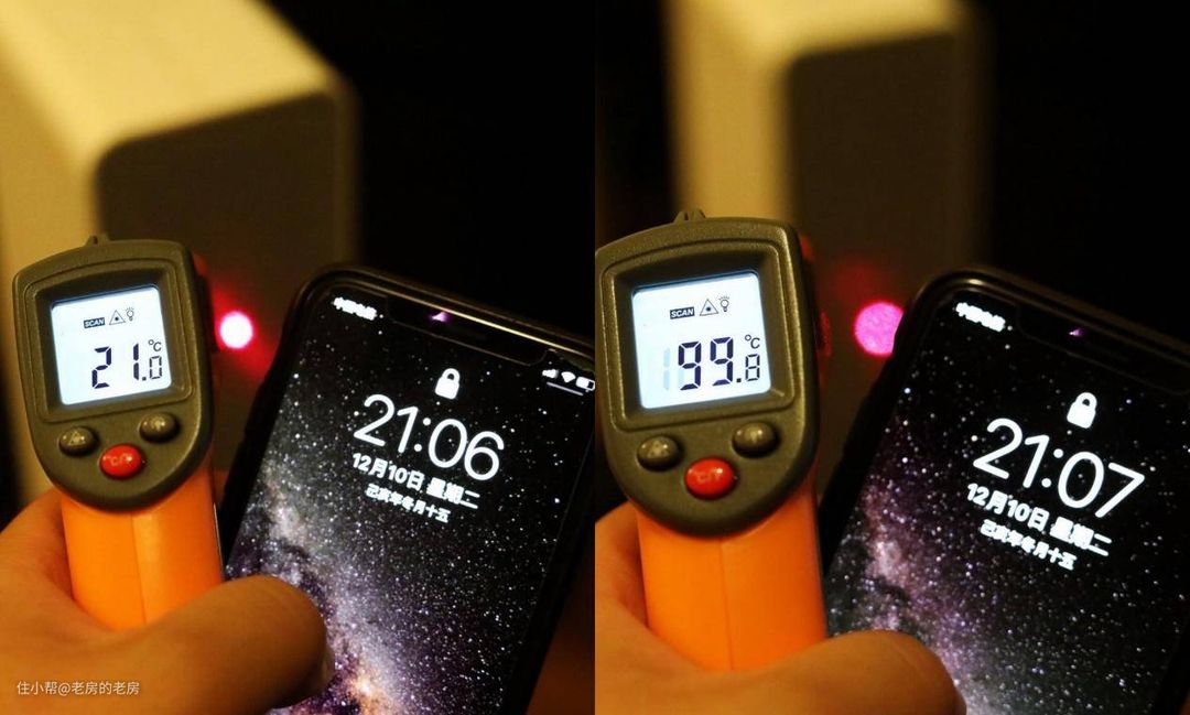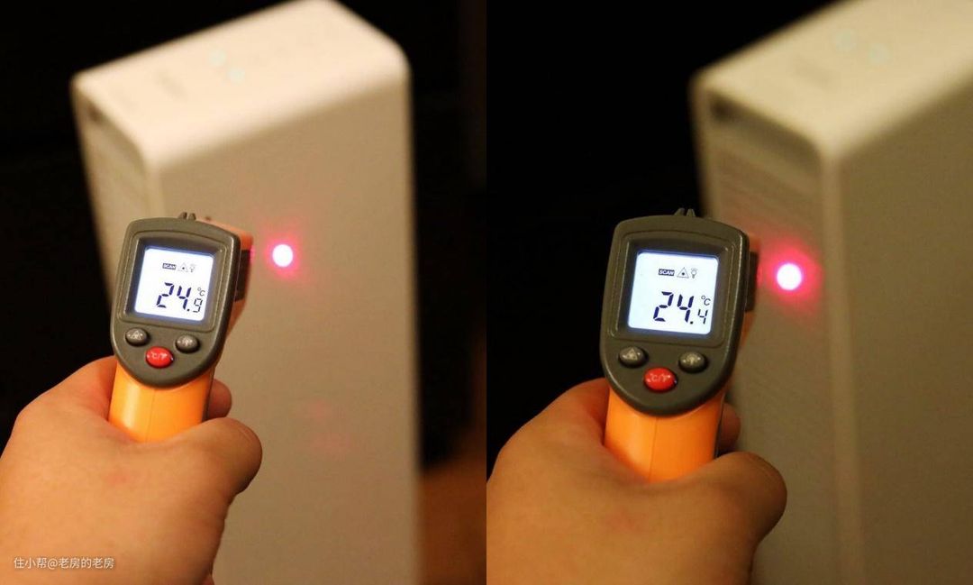 另一方面,由于是风扇式送热,并不需要整体都在发热,暖风机除风口外的其他地方的温度也是非常重要的,毕竟涉及到安全性。智米暖风机整机机身采用了RoHS认证的PC加ABS复合环保材料,整体的耐热性还是不错的。从图中可见,在运行的过程中,机身侧面和机身背部也就是进气处,温度均在室温上下,完全不用担心会被烫伤。